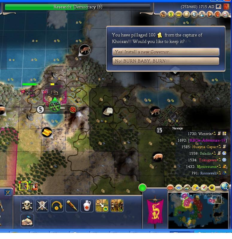 The new world expansion continues and I gain a new health resource with pigs, and a new happy resource in gold. This was one of the ideas behind my variant. I would secure a bunch of new resources from the new world. The trouble is I underestimated how much troops would be tied up fighting the natives.