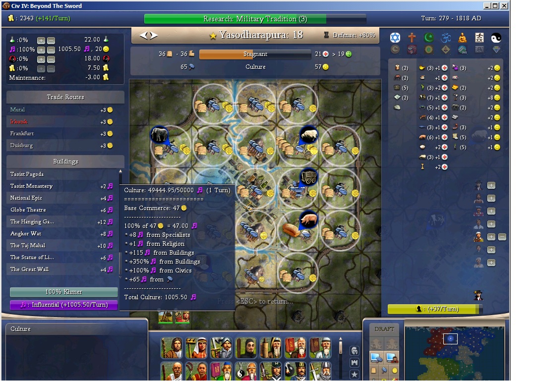 Yasod at turn 236 is the longest needed 75 and that has 2 more good culture buildings going.