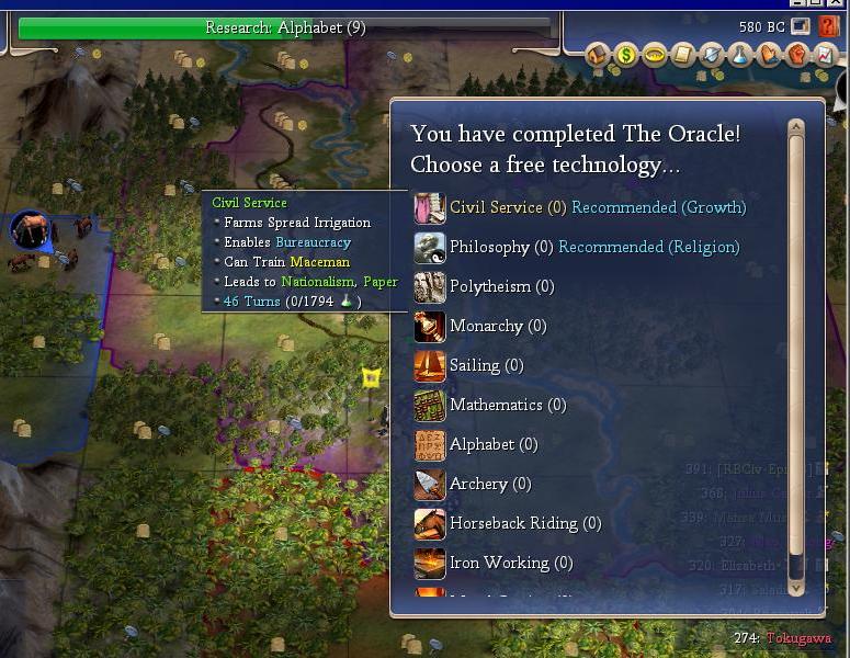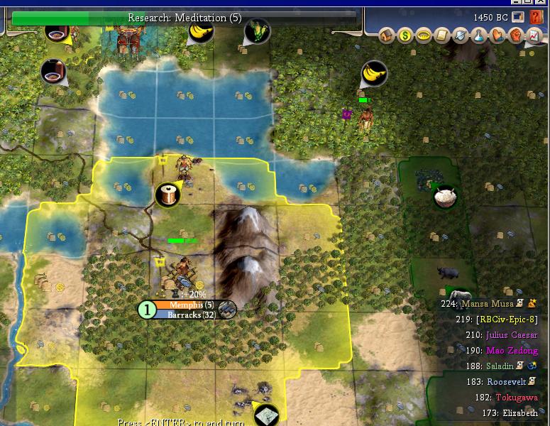 I settle the capital 2 east on the start position on the hill to get the gold tile in range. I forget how screwed up Egypt is. It is a spiritual civ that lacks Mysticism. To me one of the big advantages of spiritual is an early religion. Based on this I decide to forget the first two religions.