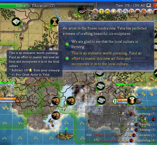 There are some interesting random events. What isn't clear is will I get my moneys worth? I don't need the cultural, so that only benefit is $3/turn + multipliers. The multipliers will take awhile to get built in Yeha.