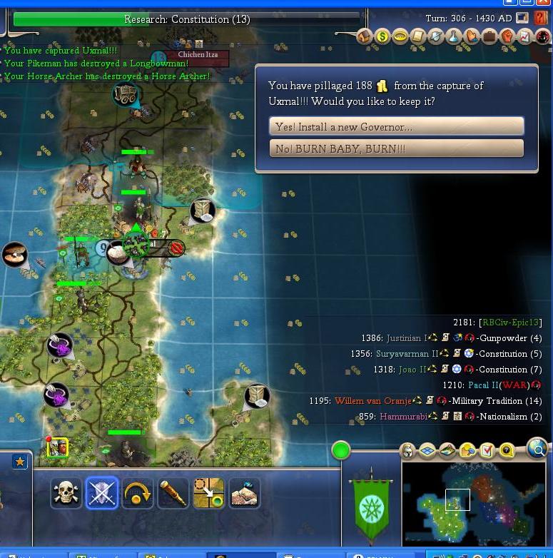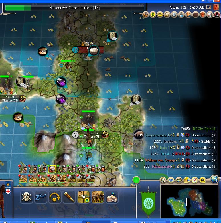 I am on the warpath again in 1405 AD. I declare on my closest neighbor - Pacal. I begin by snagging the two cities along my borders.