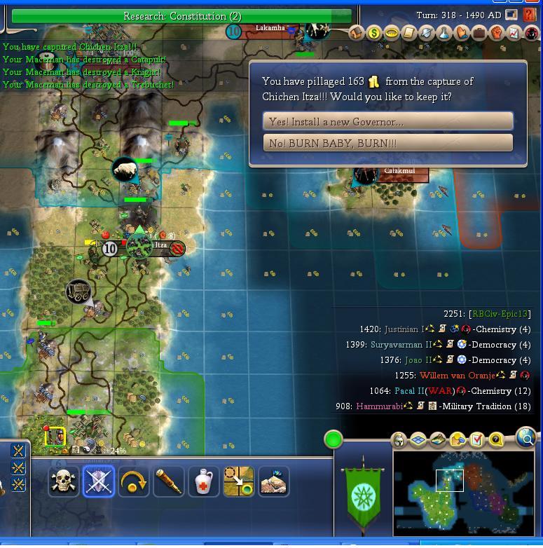 This is the end of round 1 vs. Pacal. Taking this city burned my military out, and I have zero siege units left.