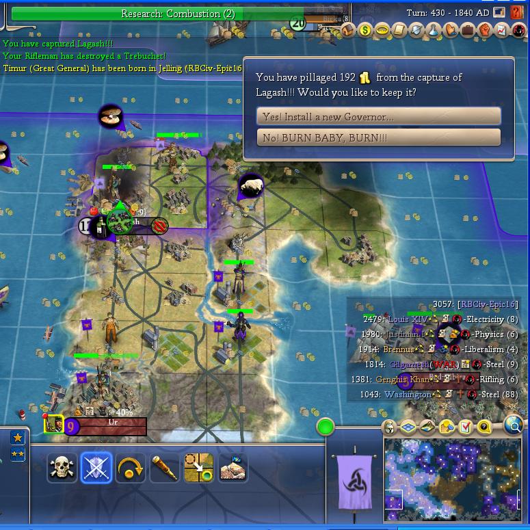 Gilgamesh chooses unwisely in 1810 AD. His first three rounds of invaders are easily slaughtered. The only thing he has done so far is to give my stack of drafted rifles their first promotion.
