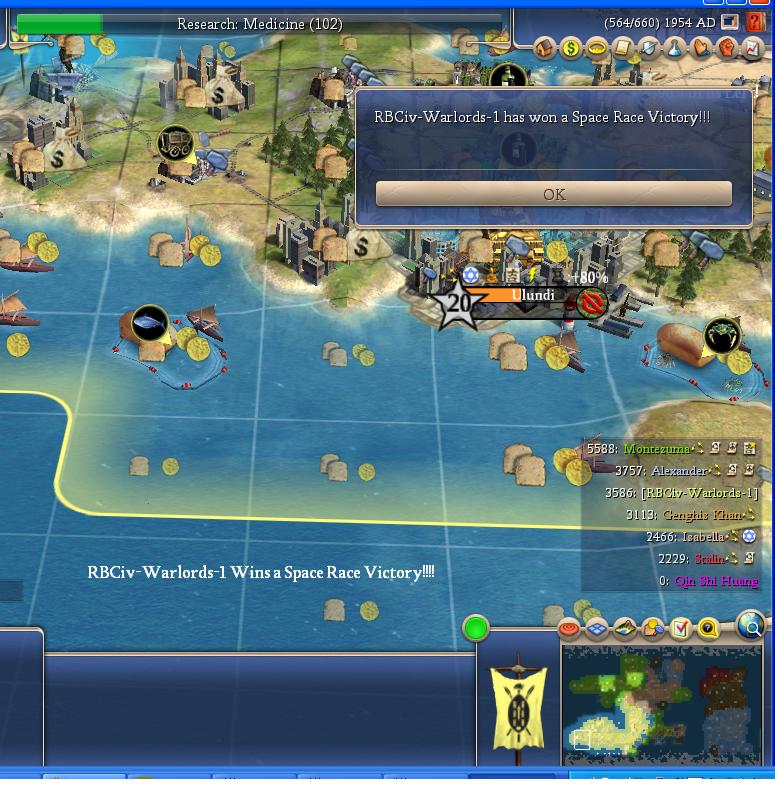 This wasn't how I wanted to win with the Zulu, but I was to far behind in tech for most of the game. Trying to fight a war with inferior units is tough. In the end I feel the decision to buddy up to Monty was right from a military standpoint, but it left me to isolated from potential trade route income.